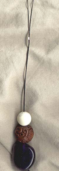 NECKLACE: dark purple amethyst nugget, carved redwood, & mother-of-pearl