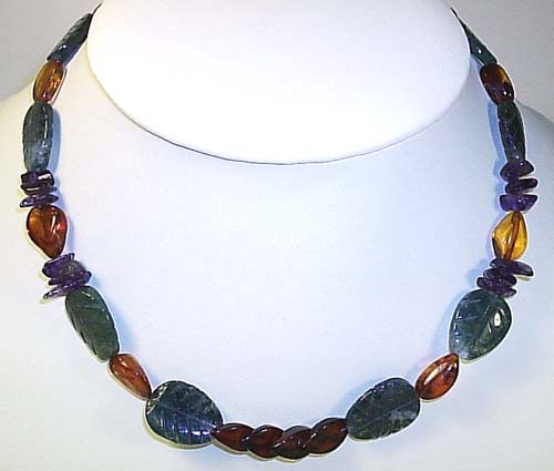 NECKLACE: cognac amber, dark purple amethyst, & moss agate