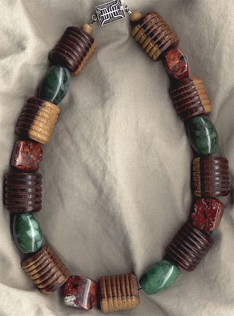 NECKLACE: African jade barrel, poppy jasper nugget, & wood