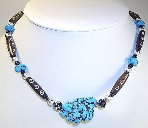 NECKLACE: Sleeping Beauty turquoise nuggets, carved camel bone, & silver crackle