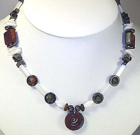NECKLACE: raku coin pendant, mother-of-pearl, & hematite