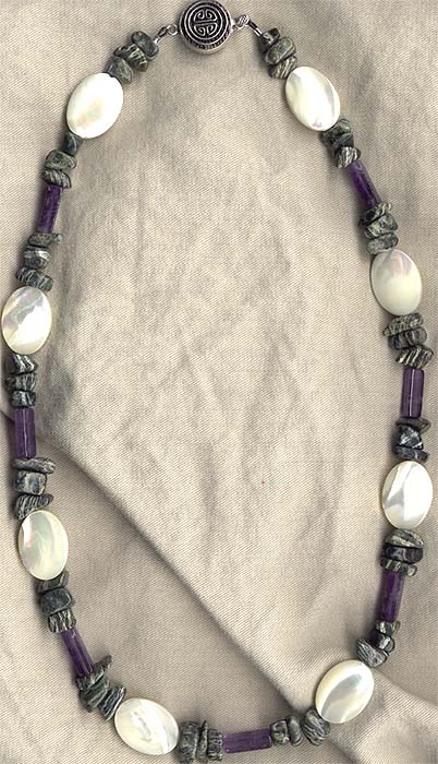 NECKLACE: dark purple amethyst, zebra jasper, & mother-of-pearl
