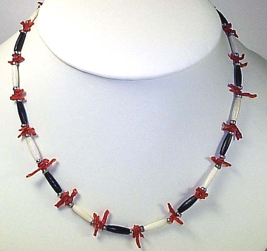 NECKLACE: natural red coral branches, camel bone, & silver