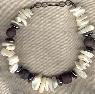 BRACELET: raku rounds, mother-of-pearl nuggets, & hematite
