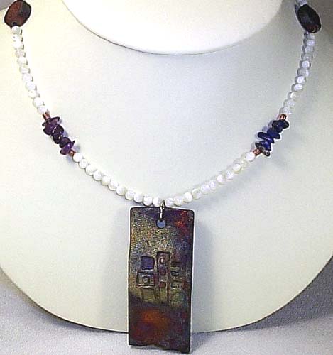 NECKLACE: raku door pendant, lapis lazuli, amethyst, & mother-of-pearl